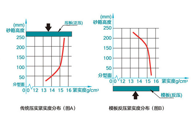 射砂結束后,模板和模型向砂箱內壓實(shí)(模板反壓),促使與模板、模型接觸的鑄型表面緊實(shí)度大幅提高(分布也比較均勻),而遠離模板和模型的砂型背面緊實(shí)度略低(圖B),有利于鑄型透氣性改善,其結果與傳統的壓實(shí)(壓板從砂型上方加壓)效果正好相反(圖A、圖B)。